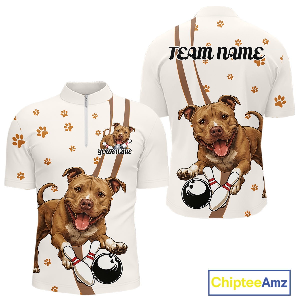 Custom Funny Brown Pitbull Dog Bowling Men Quarter-Zip Shirts, Dog Paw Print Bowler Outfit IPHW10248