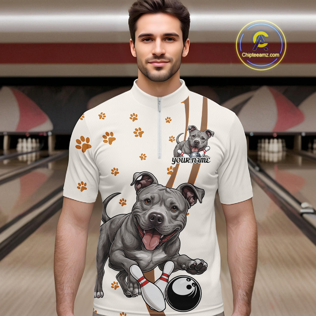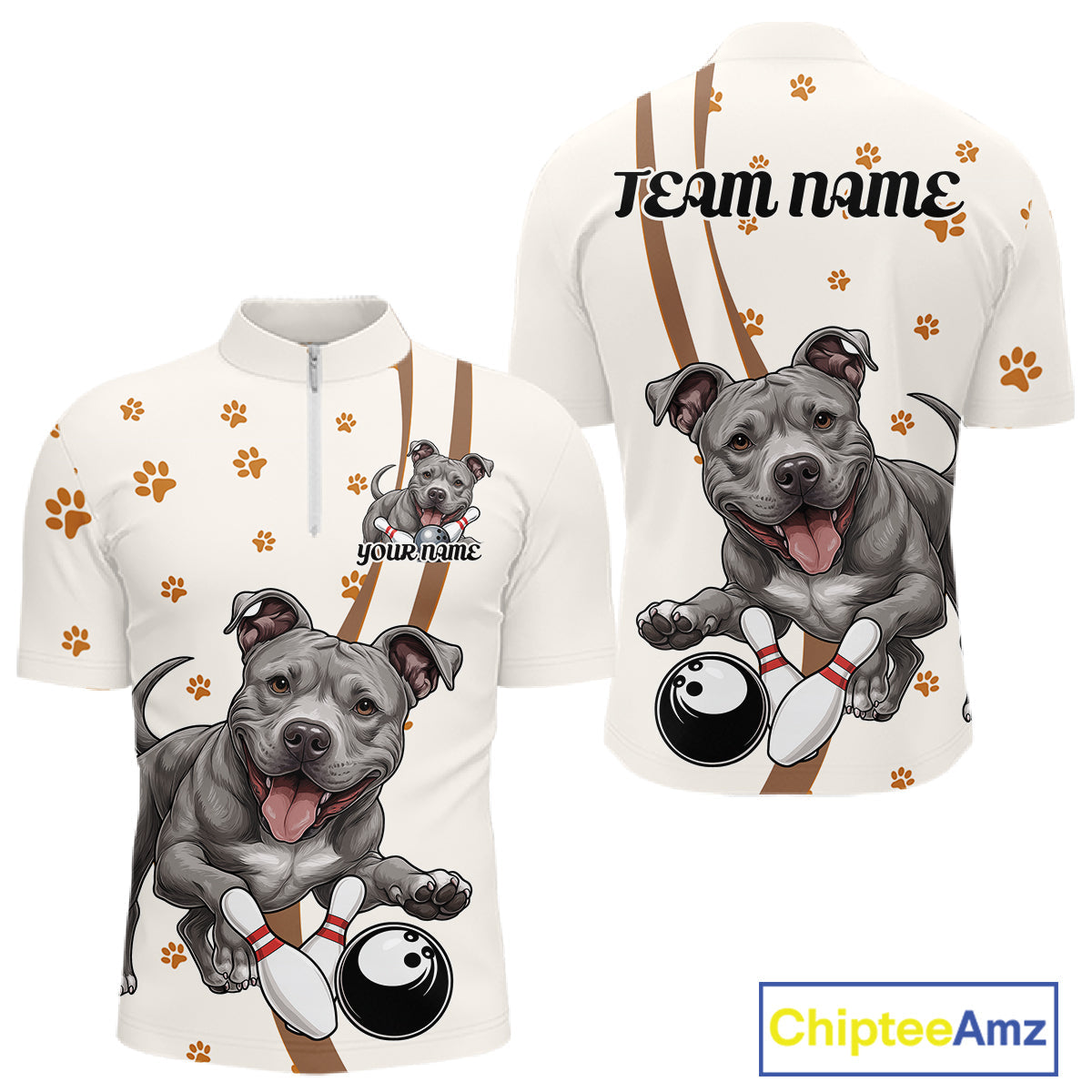 Custom Funny Pitbull Dog Bowling Men Quarter-Zip Shirts, Dog Paw Print Bowler Outfit IPHW10249
