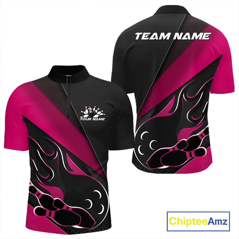 Custom Black And Pink Flame Bowling Men Quarter-Zip Shirt, Team Bowling League Shirt IPHW10256