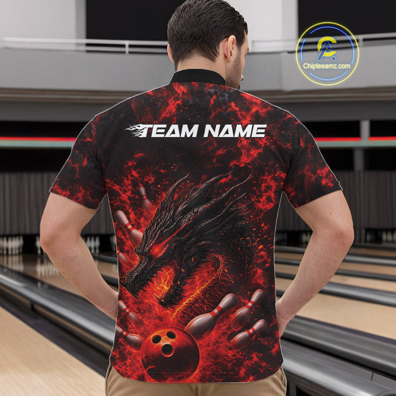 Custom Black And Red Flame Dragon Bowling Men Quarter-Zip Shirt, Dragon Bowling League Shirt IPHW10277