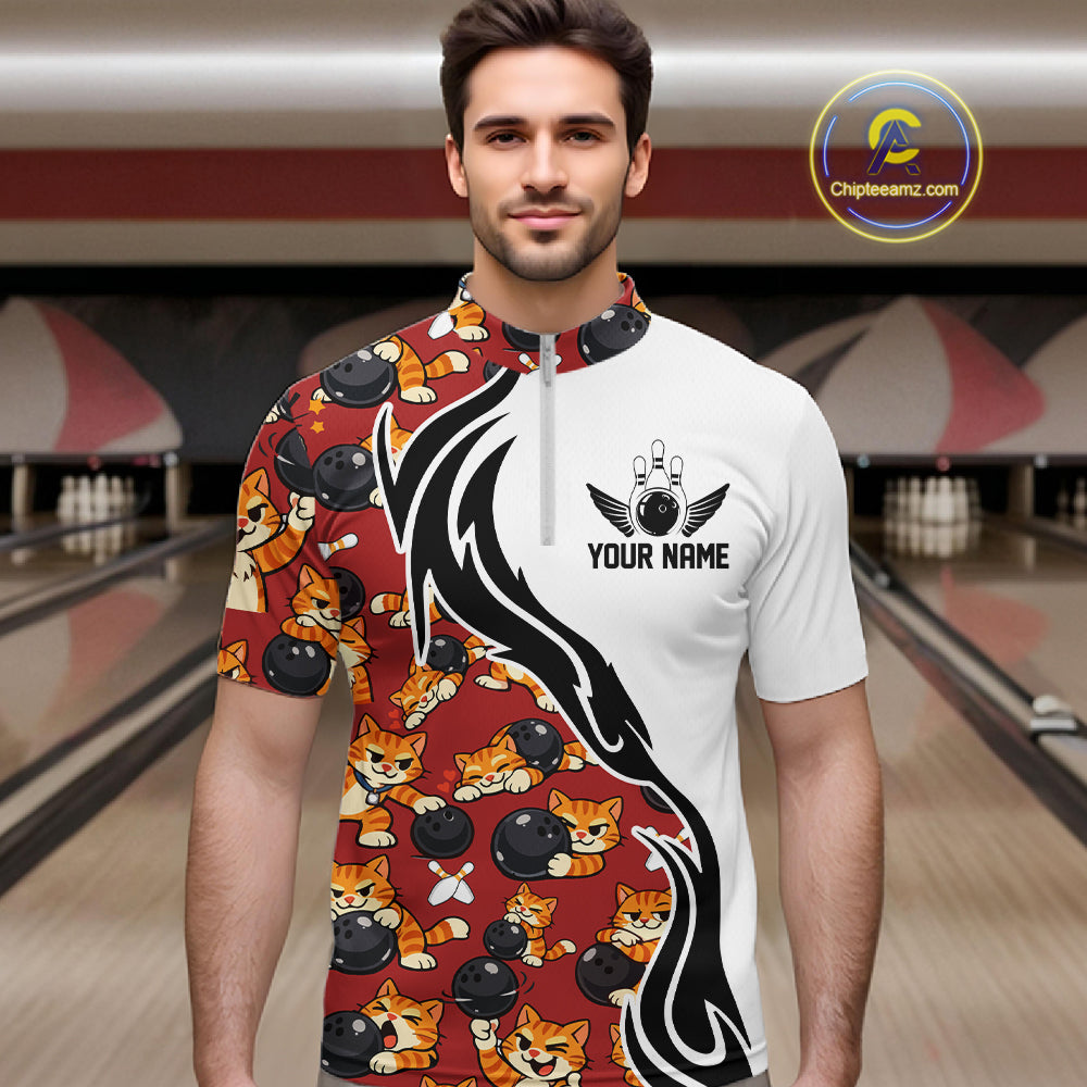 Custom Cute Funny Ginger Tabby Cat Bowling Men Quarter-Zip Shirts, Cat Bowling Team Shirt IPHW10318