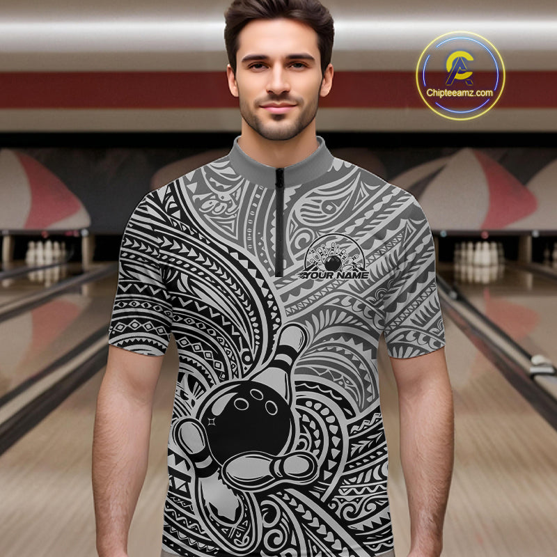 Custom Black And Gray Traditional Samoan Tribal Polynesian Pattern Bowling Men Shirt IPHW10324