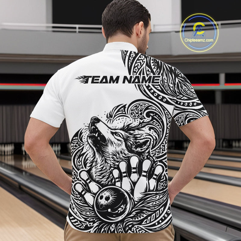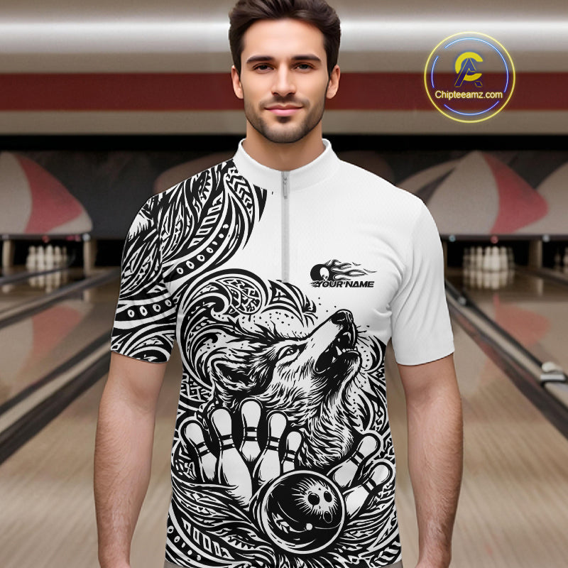 Custom Black And White Tribal Pattern Maori Style Wolf Bowling Team Men Quarter-Zip Shirts IPHW10330