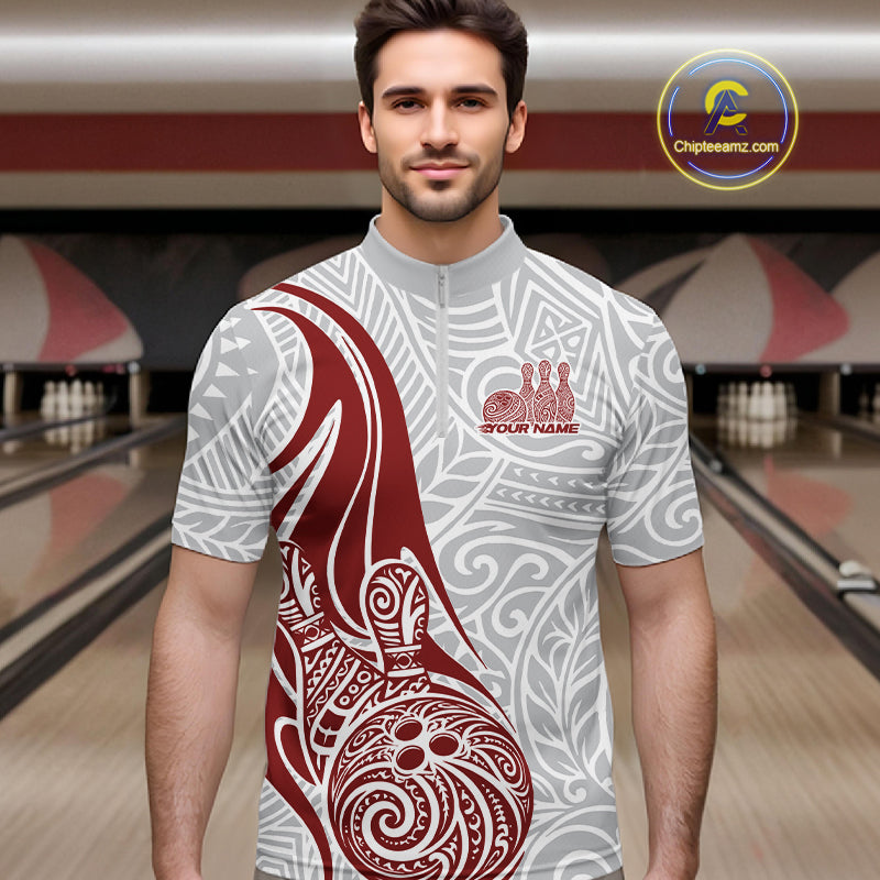 Custom Red Polynesian Tribal Bowling Men Quarter-Zip Shirt, Maori Style Bowling Shirt IPHW10337