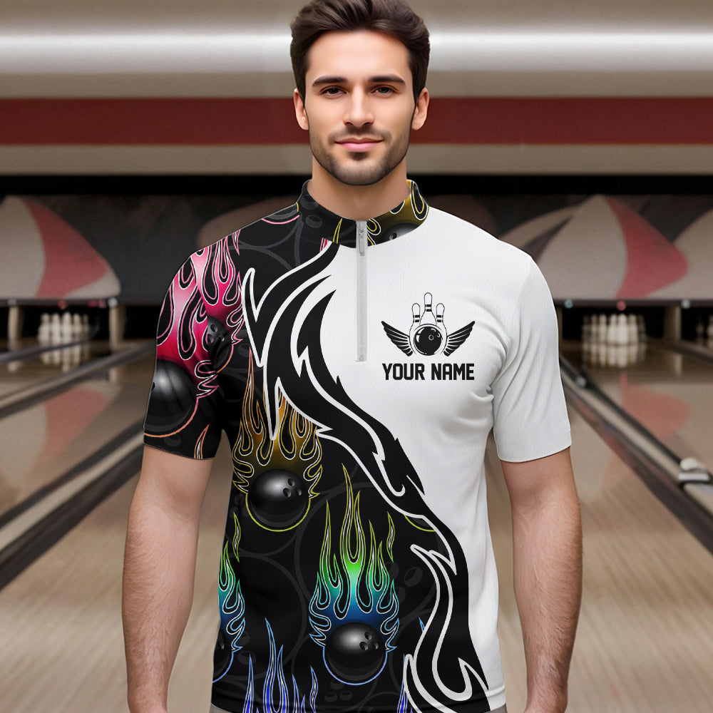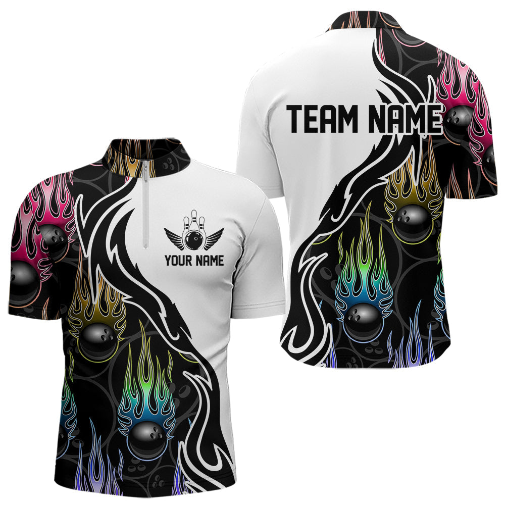Colorful Rainbow Flame Ball Custom Bowling Team Men Quarter-Zip Shirts, Fire Bowling League Shirt IPHW8865