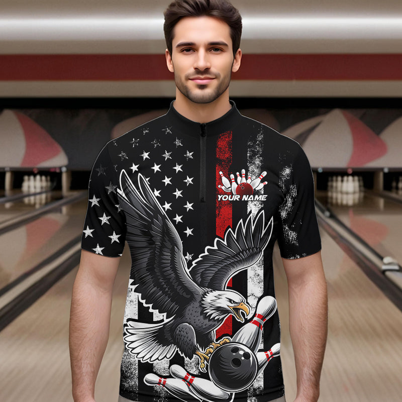 Custom Red Line American Flag Eagle Bowling Men Quarter-Zip Shirt, Patriotic US Bowling Shirt IPHW8939