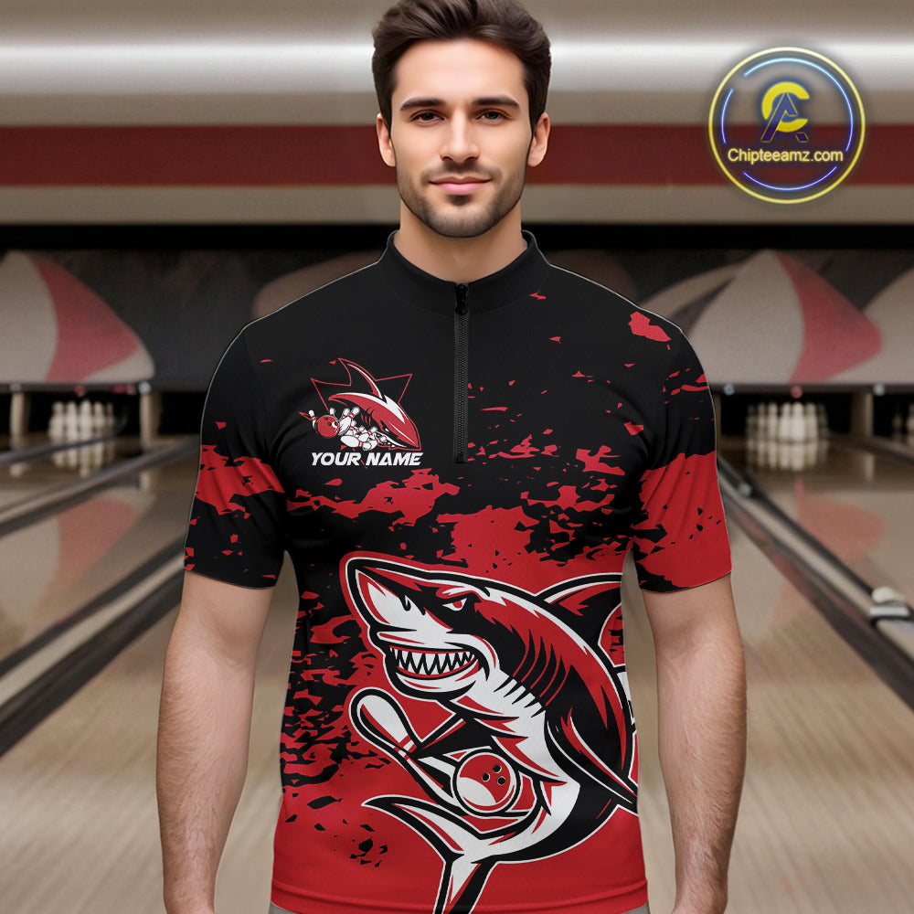 Custom Black And Red Camo Shark Bowling Team Men Quarter-Zip Shirts, Bowling Tournament Shirt IPHW8995