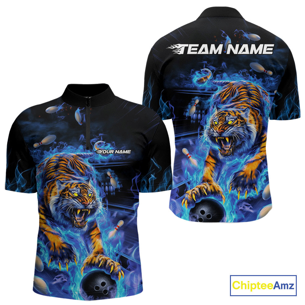 Custom Blue Fire Flame Tiger Bowling Team Quarter-Zip Shirts For Men, Tiger Bowling Jerseys IPHW9481