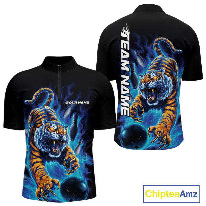 Custom Blue Fire Flame Tiger Bowling Team Quarter-Zip Shirts For Men, Tiger Bowling Jerseys IPHW9485