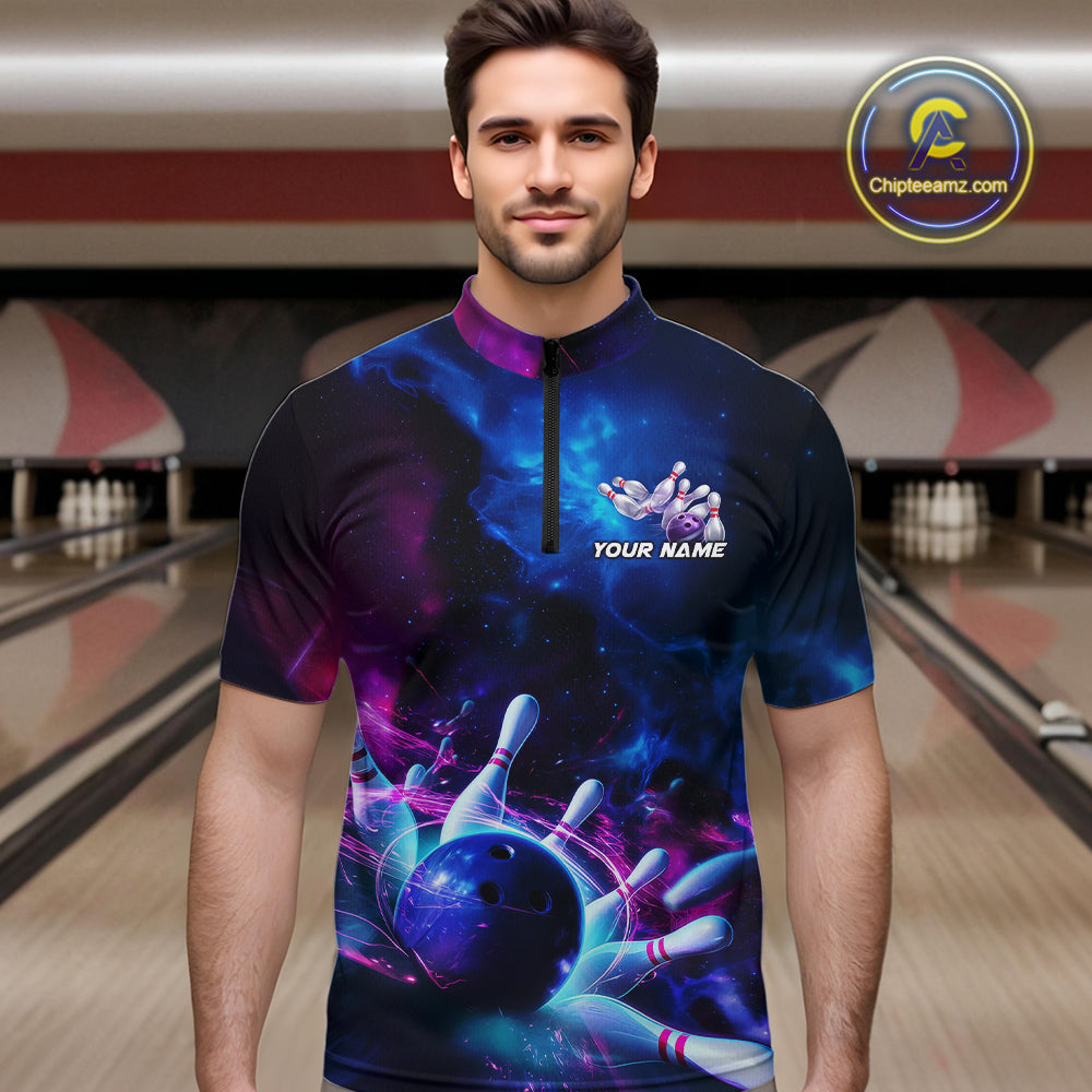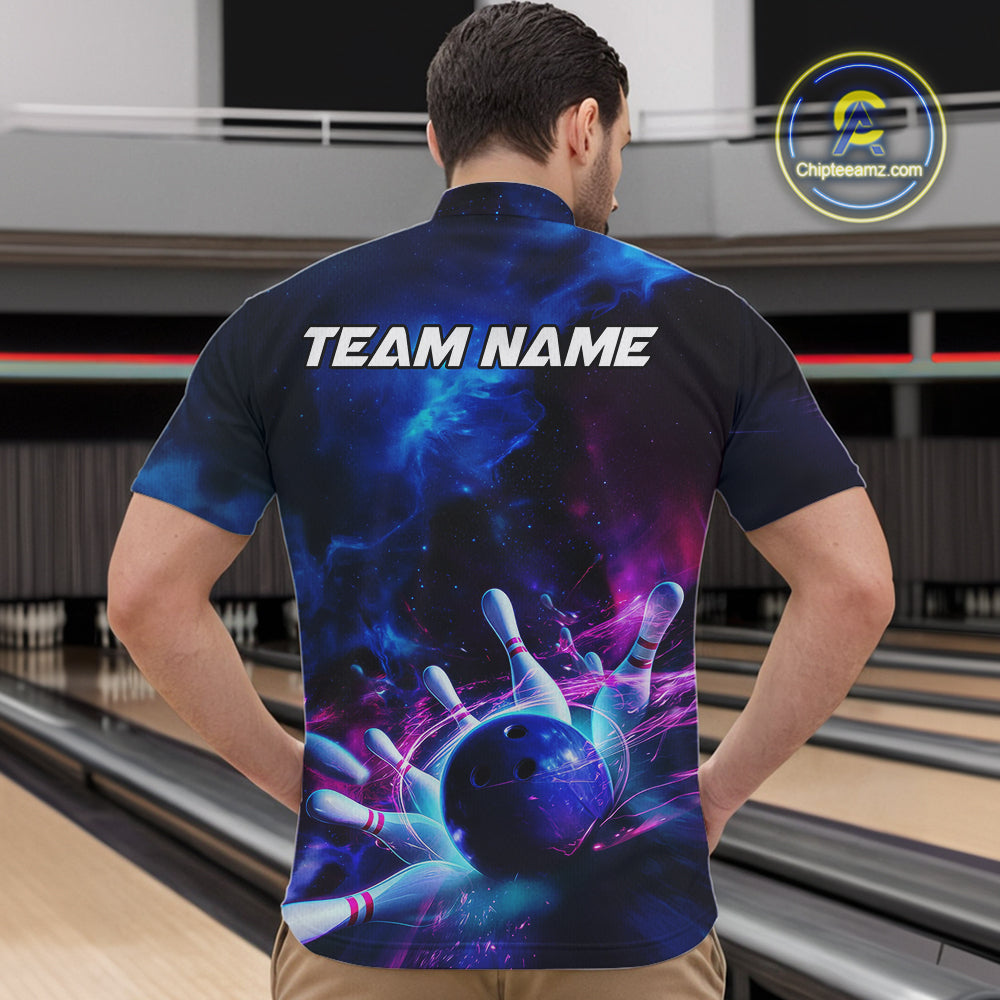 Custom Galaxy Bowling Men Quarter-Zip Shirts, Holographic Bowling Jersey Bowling League Shirt IPHW9500