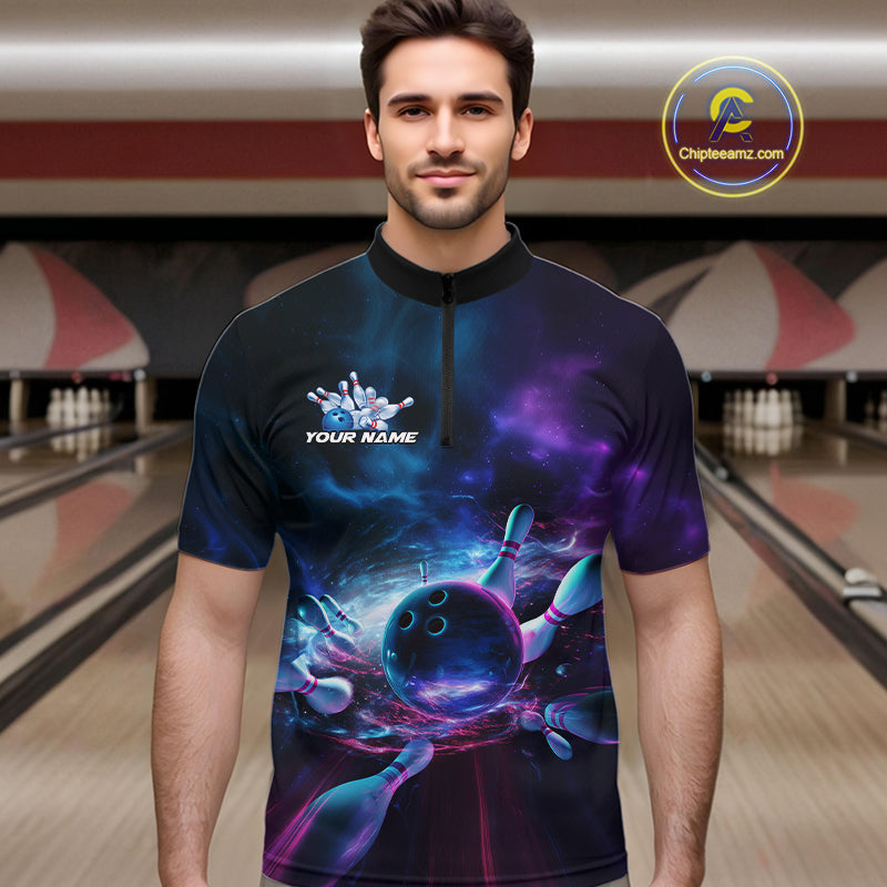Custom Galaxy Bowling Quarter-Zip Shirts For Men, Holographic Bowling Team Shirt IPHW9502