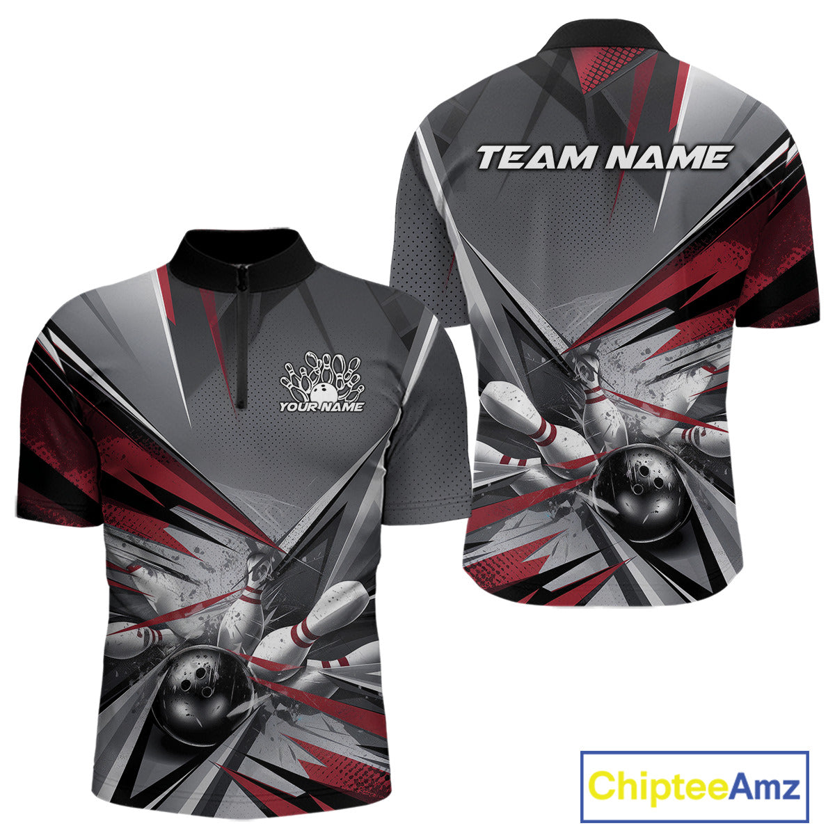 Custom Red And Gray Bowling Quarter-Zip Team Shirts For Men, Bowler Outfit Bowling League Shirt IPHW9557