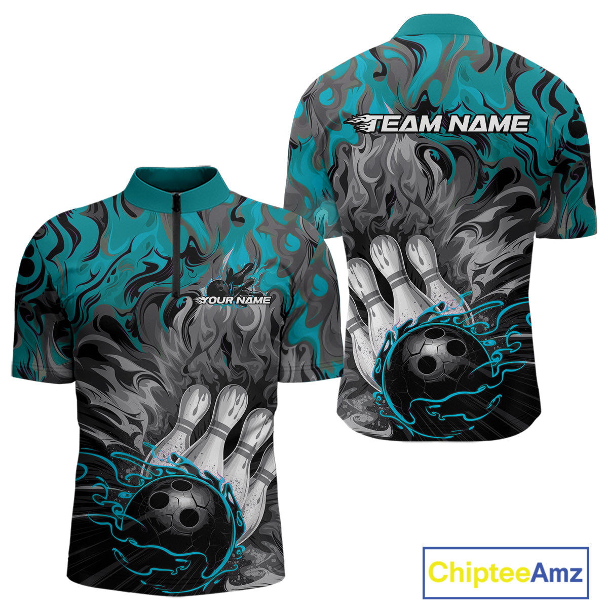Custom Blue Fame Bowling Team Quarter-Zip Shirts For Men, Fire Bowling Jerseys IPHW9560