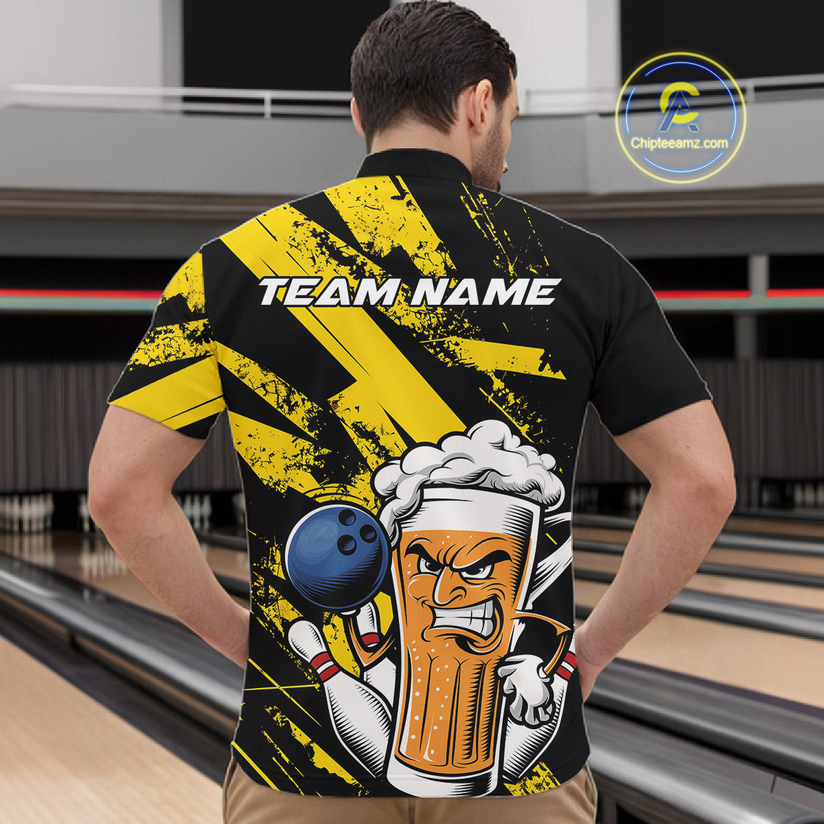 Custom Grunge Yellow Funny Bowling And Beer Quarter-Zip Shirts For Men, Bowling Team Uniform IPHW9607