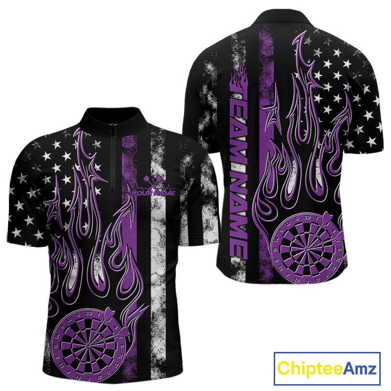 Custom Purple Thin Line US Flag Patriotic Flame Dartboard Dart Men Quarter-Zip Shirt, Dart Jersey IPHW9642
