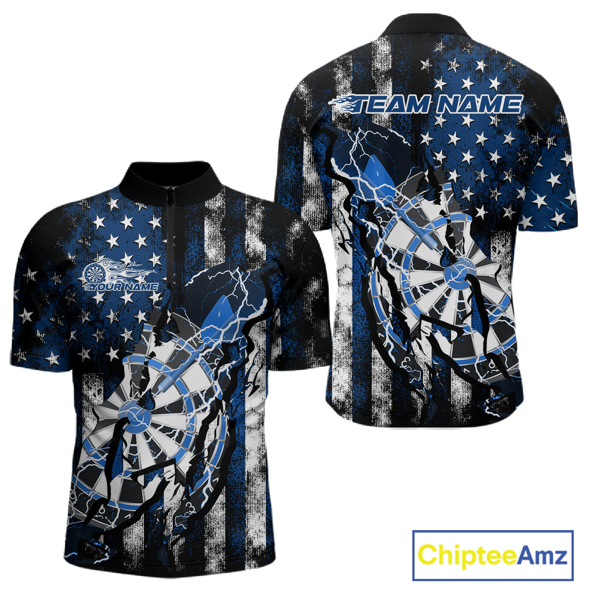 Custom Blue Thunder Lightning Patriotic Dart Team Quarter-Zip Shirts For Men, Dart Jerseys IPHW9657