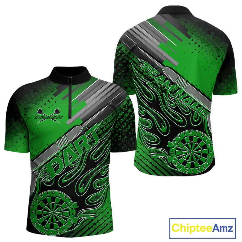 Custom Black And Irish Green Flame Dartboard Dart Quarter-Zip Shirts For Men, Dart Uniform IPHW9686