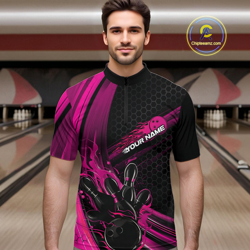 Custom Black And Pink Flame Bowling Jerseys, Bowling Team Quarter-Zip Shirts For Men IPHW9886