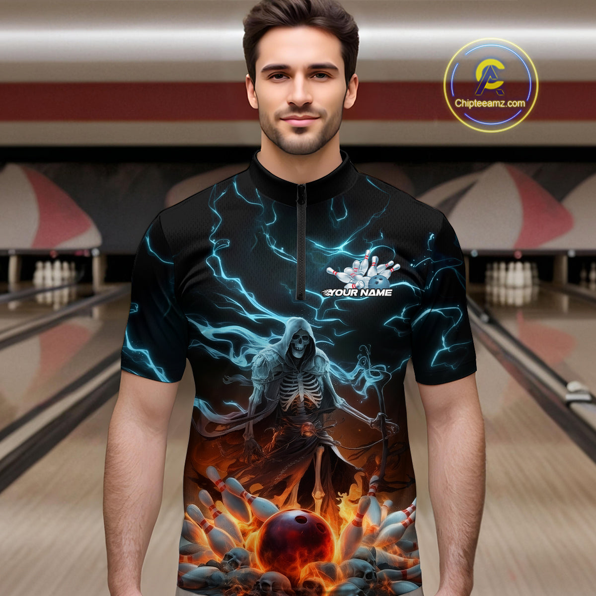 Custom Blue Lightning Grim Reaper Bowling Men Quarter-Zip Shirt, Flame Halloween Outfit IPHW9899