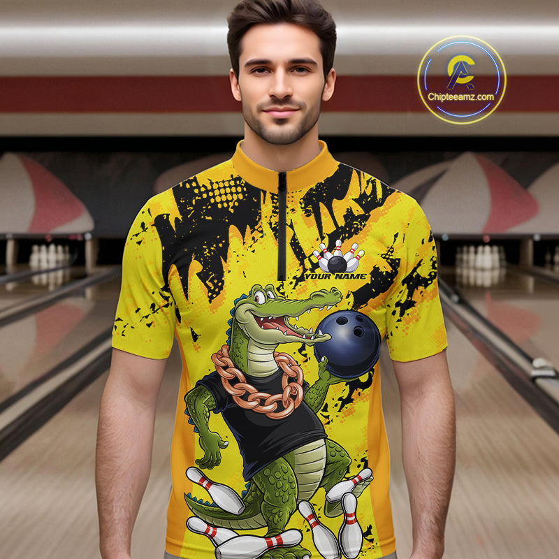 Custom Funny Alligator Bowling Quarter-Zip Shirt For Men, Grunge Yelllow Bowling Team Jerseys IPHW9922
