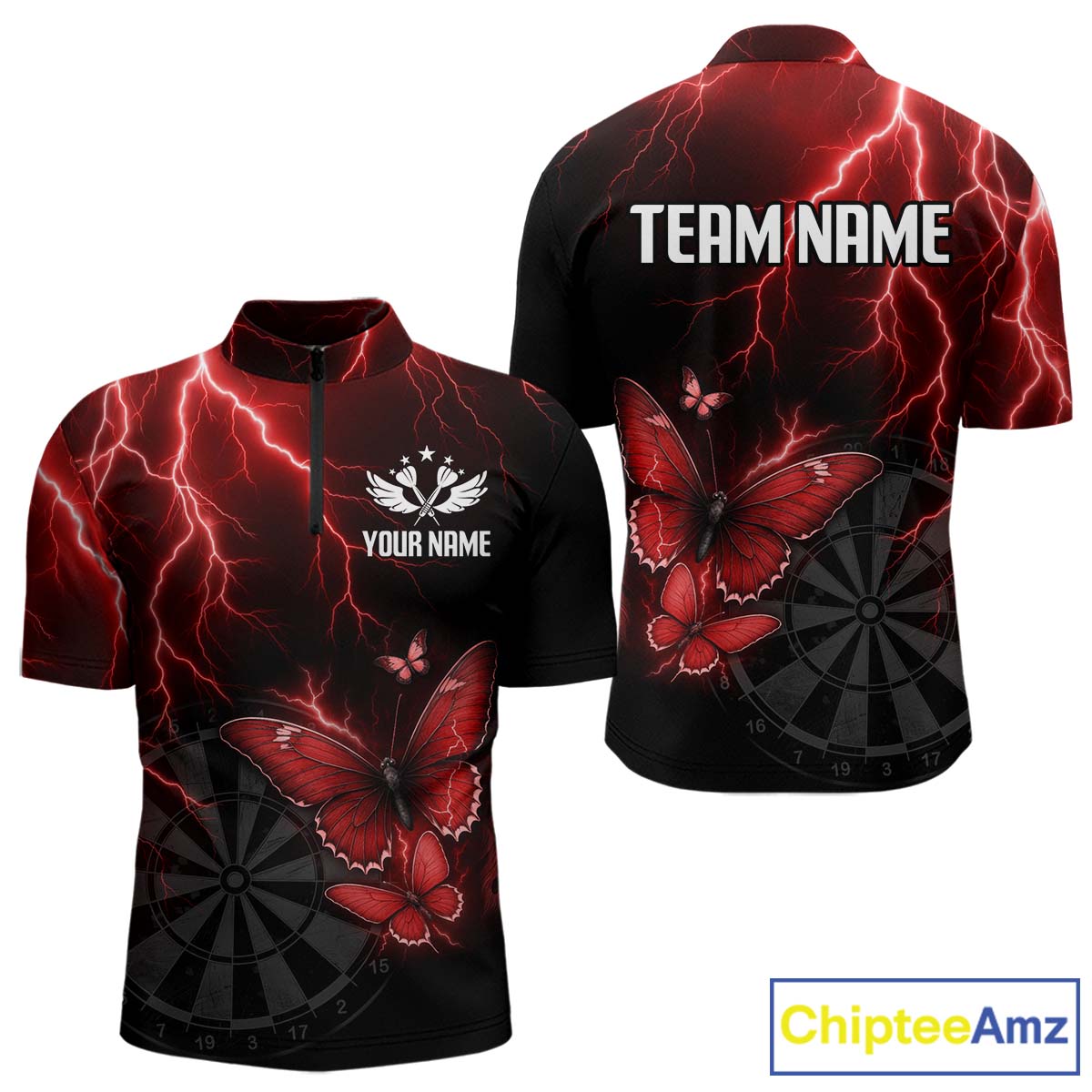 Custom Men 1/4-Zip Darts Shirt With Maroon Lightning & Glowing Butterfly, Darts Jersey NYN1019