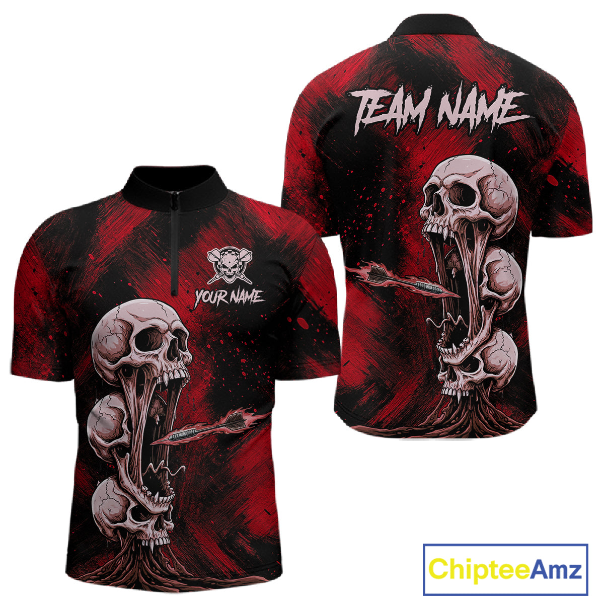 Custom Red Grunge Creepy Skull Flame Dart Arrow Men Darts Quarter-Zip Shirt Dart Jerseys NYN1939