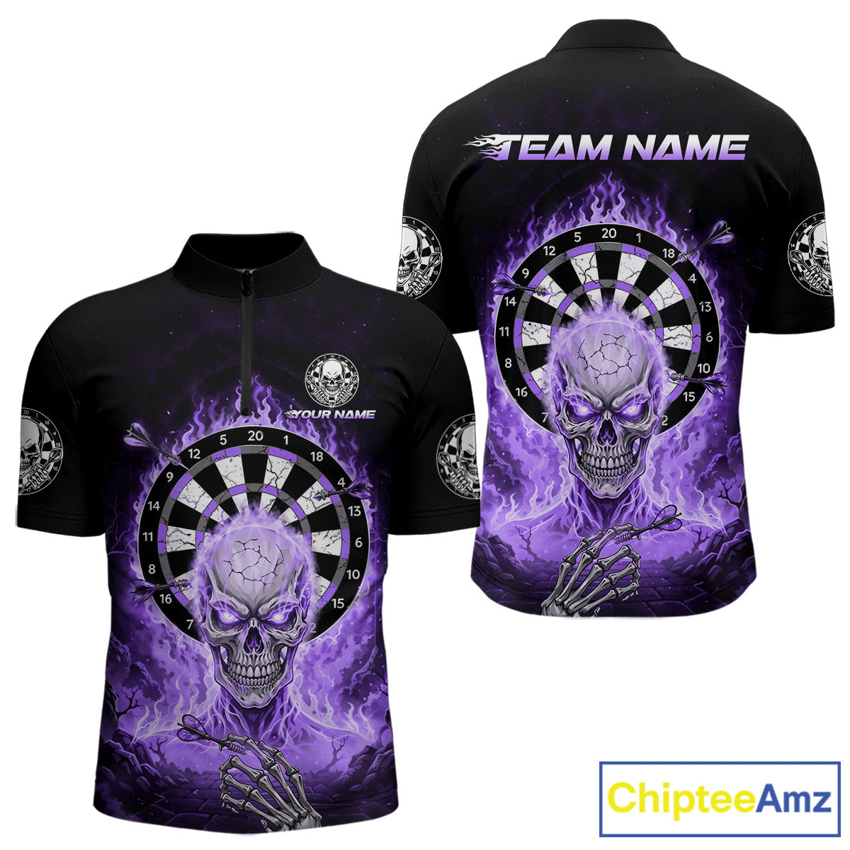 Black Purple Flaming Skeleton Darts Custom Men's Dart Quarter-Zip Shirts Team Dart League Jerseys NYN2074