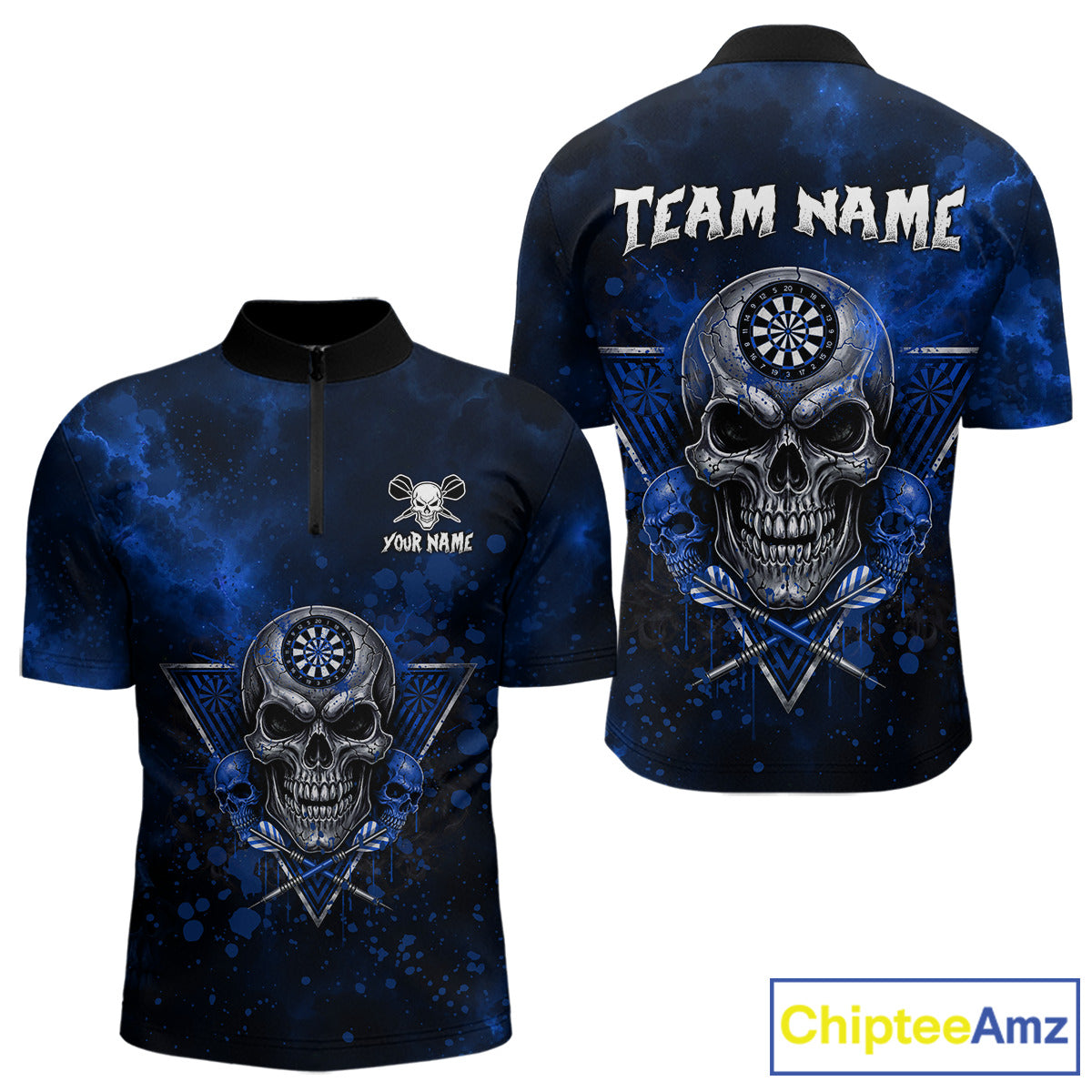Custom Blue Splatter Multi-Skull Men Darts Arrow Quarter-Zip League Shirts Dart Team Jerseys NYN2201