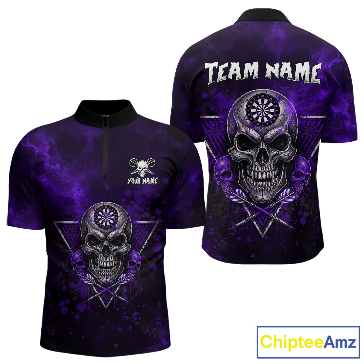 Custom Purple Splatter Multi-Skull Men Darts Arrow Quarter-Zip League Shirts Dart Team Jerseys NYN2202