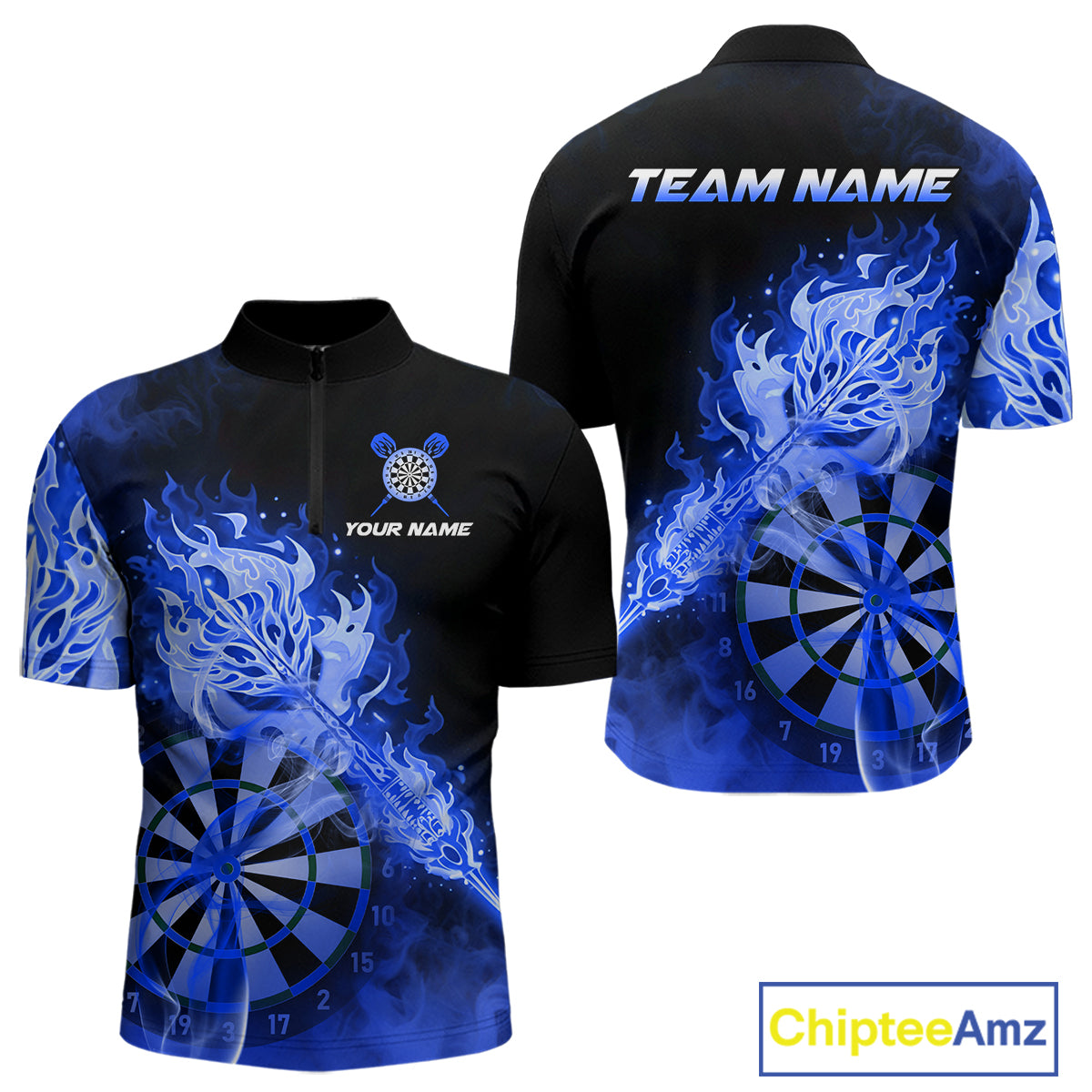 Custom Smoke Blue Fire Flaming Dart Arrow Men Darts Quarter-Zip League Shirts Dart Team Jerseys NYN2215