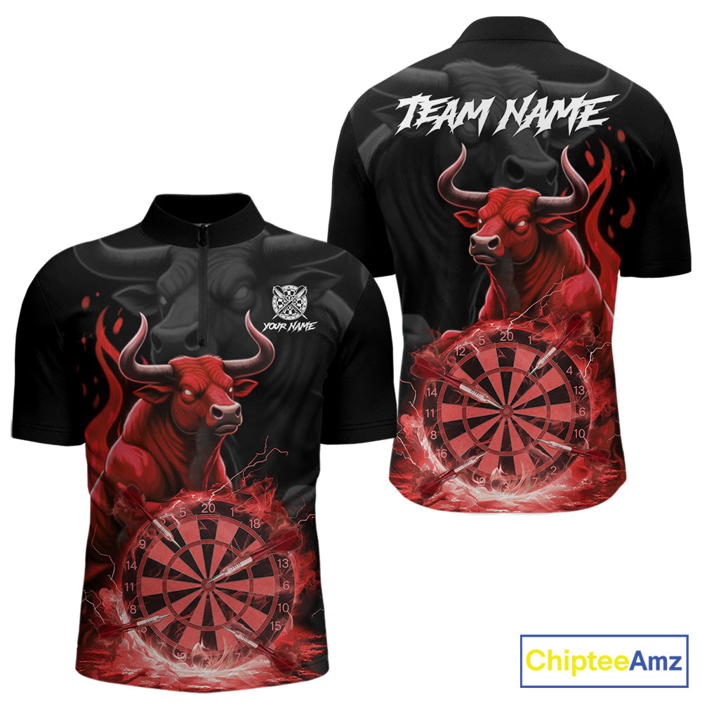 Red Funny Bull Fire Flame Dartboard Custom Men Darts Quarter-Zip League Shirts Dart Jerseys NYN2244