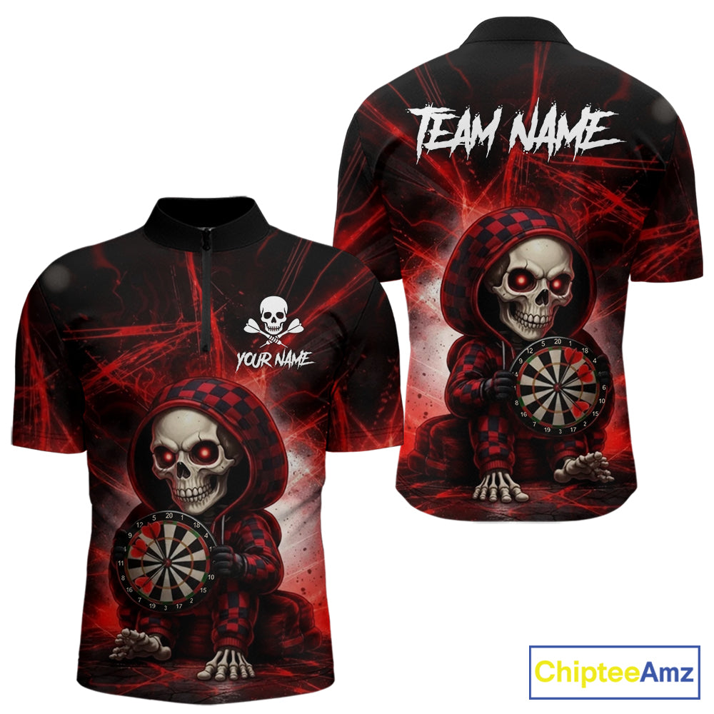 Black & Red Grunge Light Caro Skeleton Men Darts 1/4-Zip Shirt Custom Funny Dart Team Jerseys NYN2539