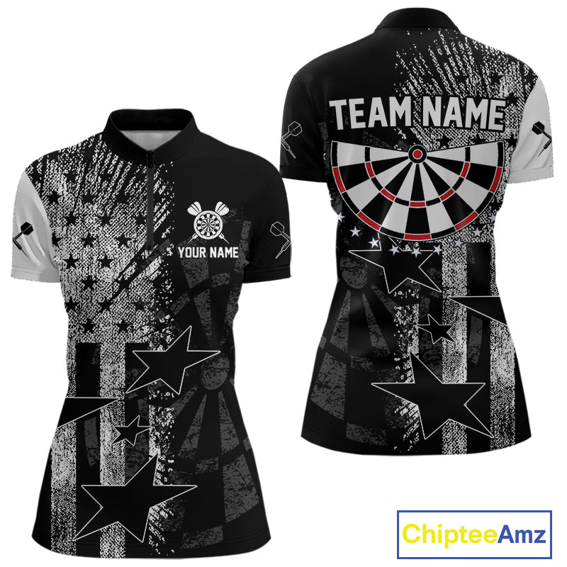 US Flag Grunge Star Dartboard Women's Darts Quarter-Zip Shirt - Custom Name For Players NYN0756