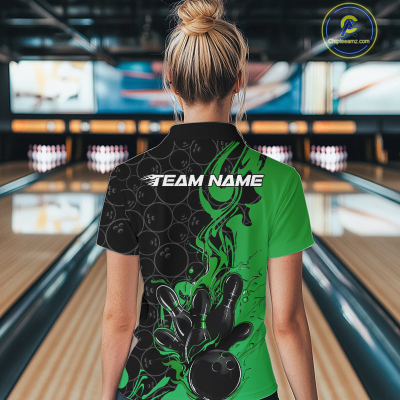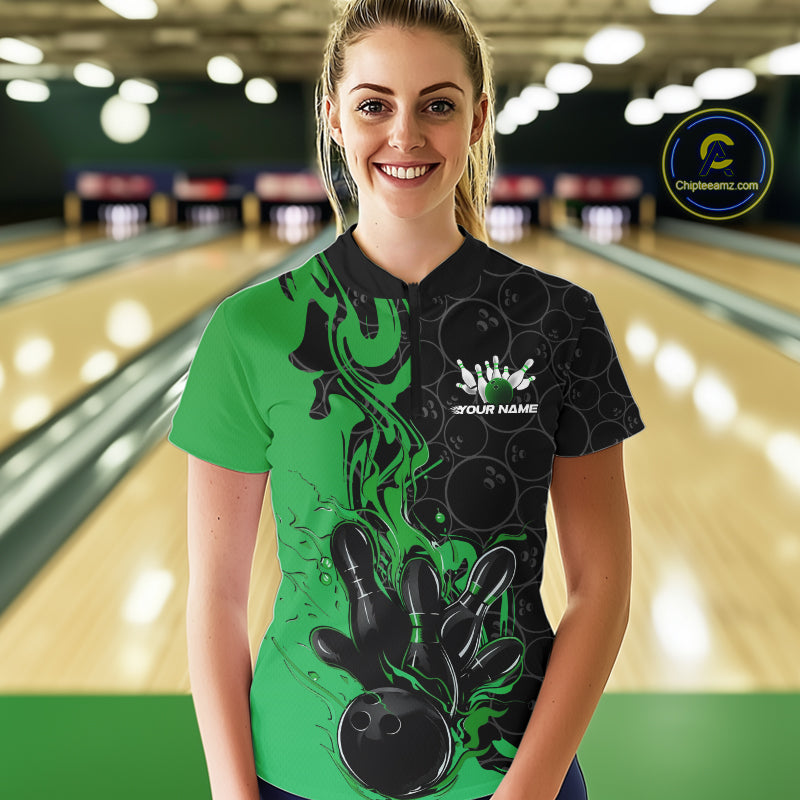 Custom Black And Green Flame Bowling Team Women Quarter-Zip Shirts, Bowling League Shirt IPHW10189
