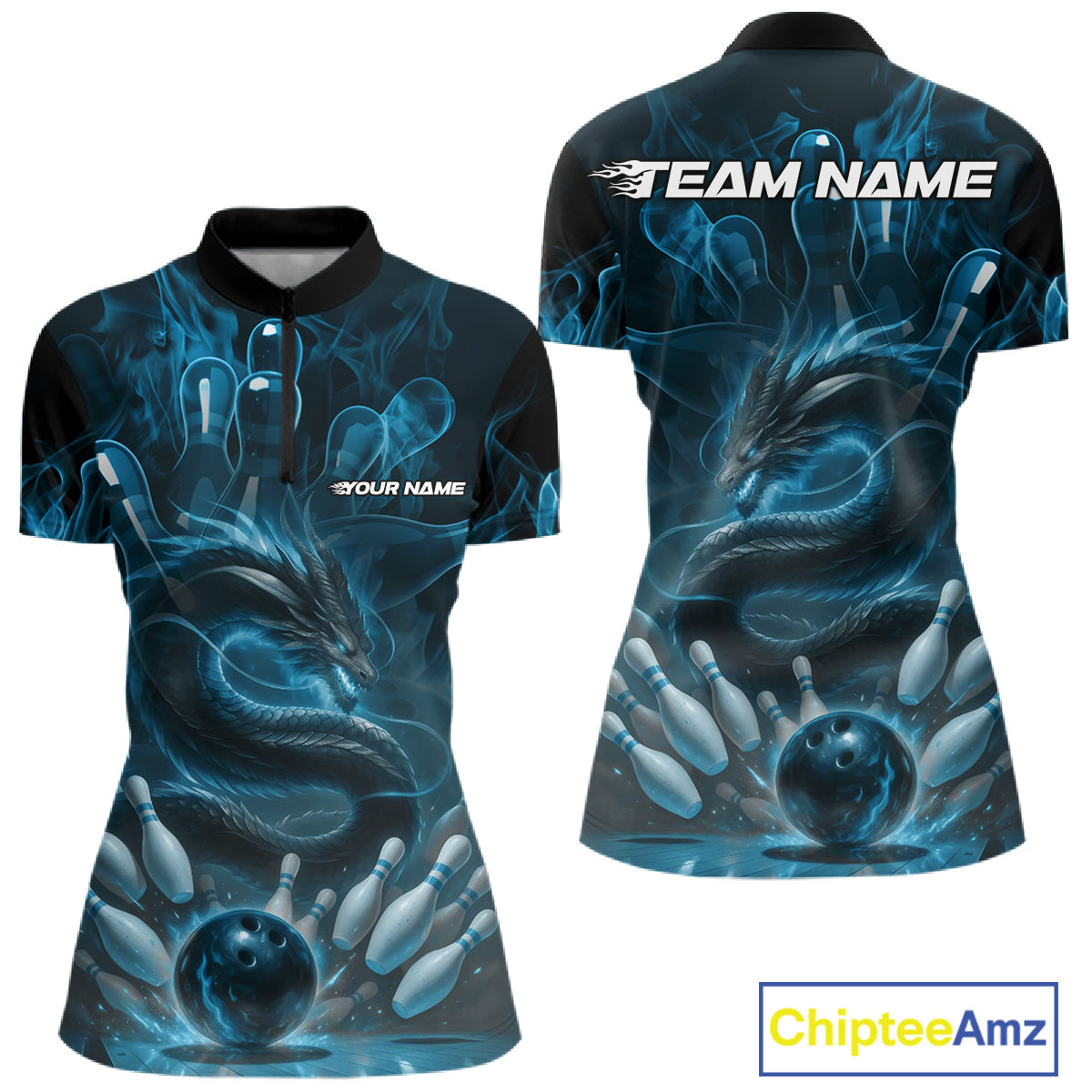Custom Blue Flame Dragon Bowling Women Quarter-Zip Shirts, Dragon Bowling League Shirt IPHW10224