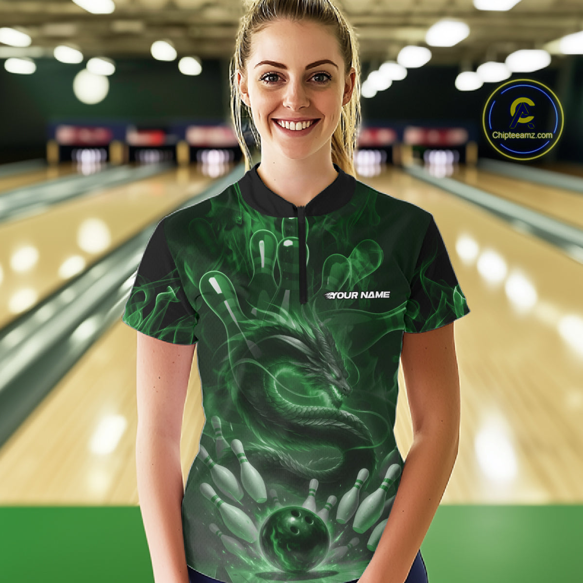 Custom Green Flame Dragon Bowling Women Quarter-Zip Shirts, Dragon Bowling League Shirt IPHW10228