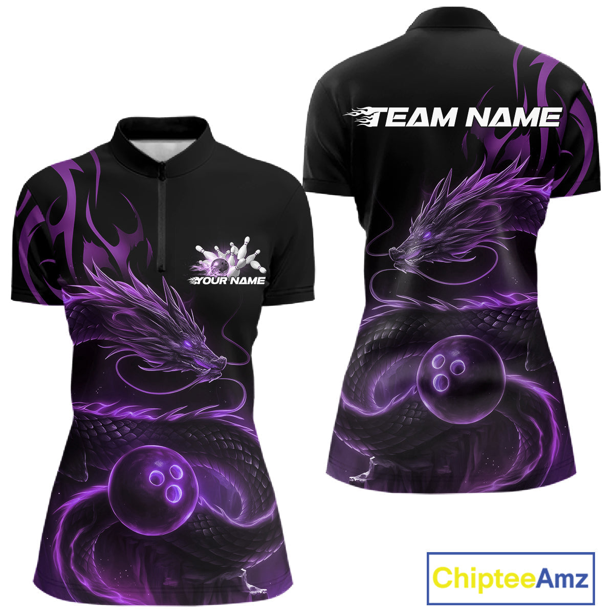 Custom Purple Tribal Flame Dragon Bowlin Women Quarter-Zip Shirt, Dragon Bowling Jerseys IPHW10231