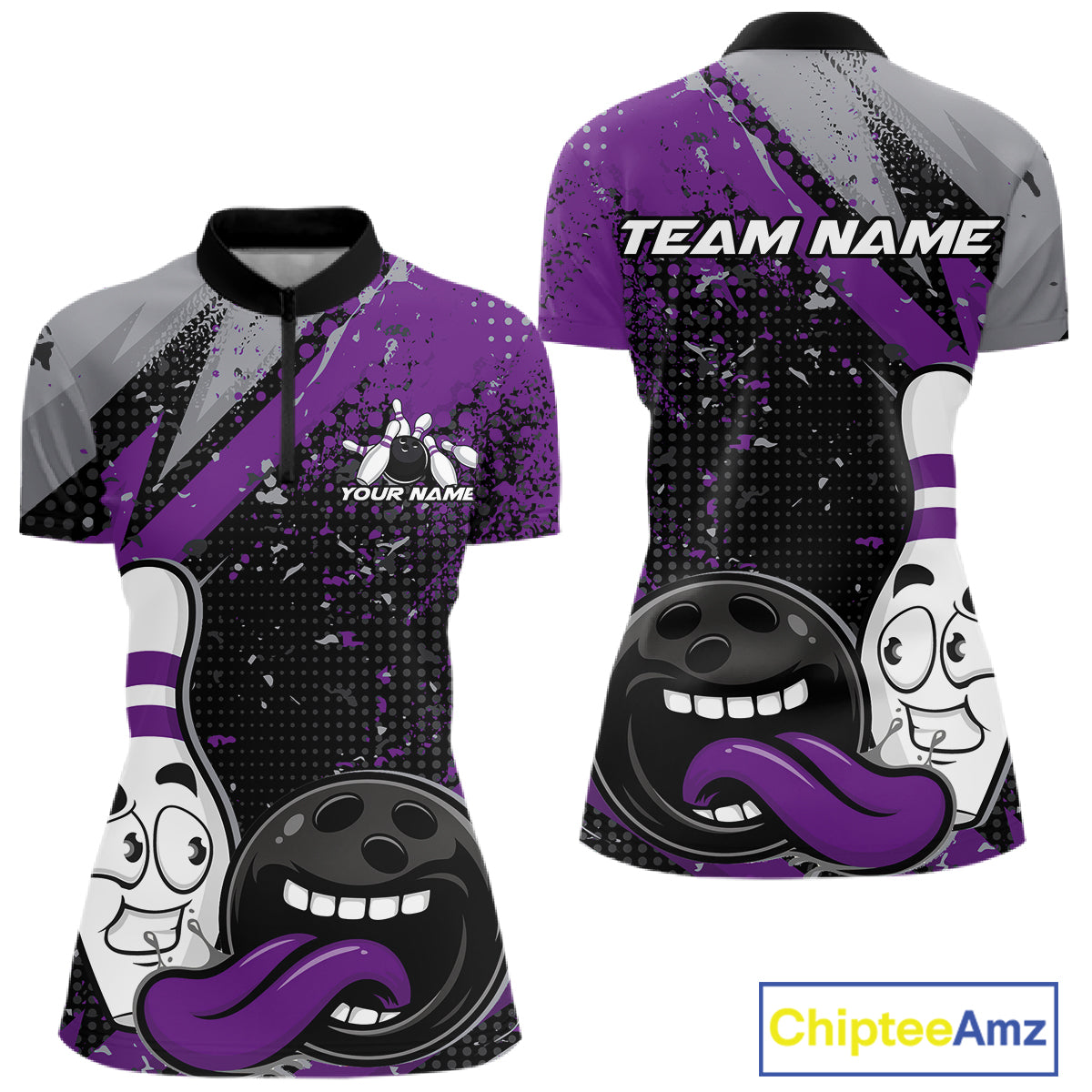 Custom Funny Bowling Women Quarter-Zip Shirt, Purple Bowling Ball And Pin Bowling Jersey IPHW10259
