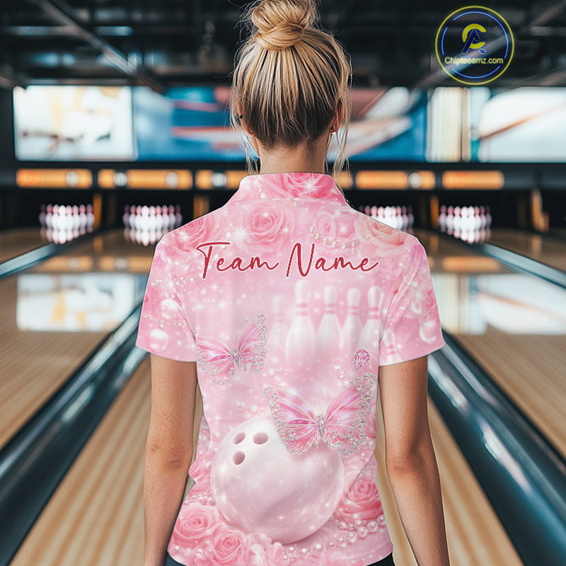 Custom Elegant Roses And Butterfly Women Bowling Quarter-Zip Shirt, Ladies Bowling Shirt IPHW10312