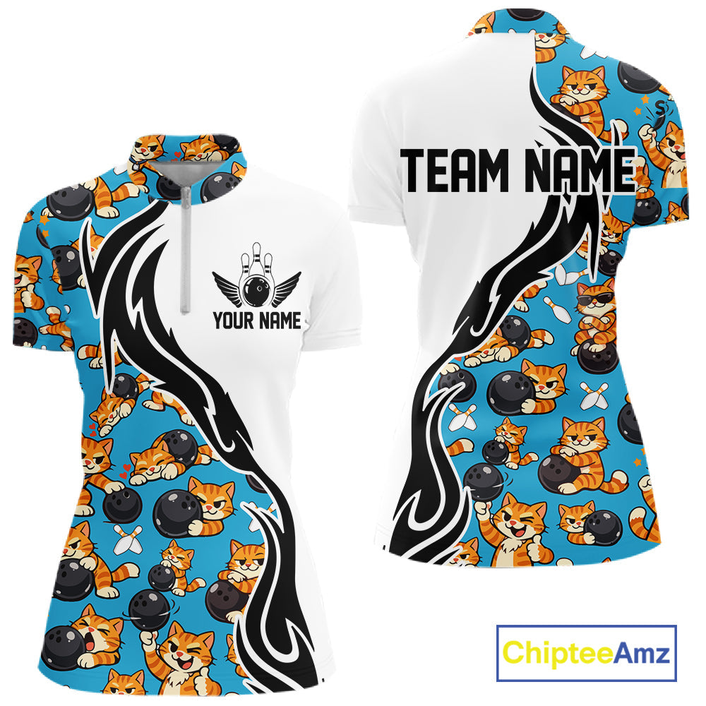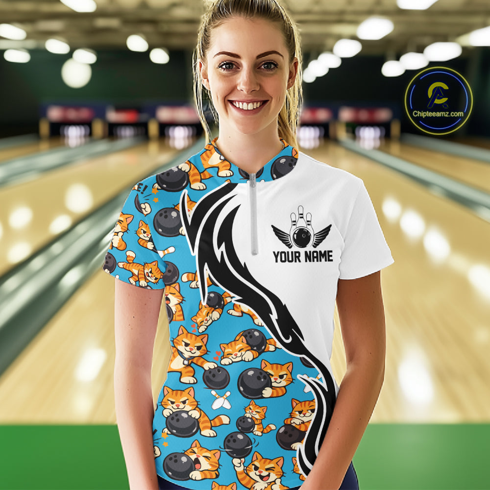 Custom Cute Funny Ginger Tabby Cat Bowling Women Quarter-Zip Shirts, Bowling Team Shirt IPHW10320