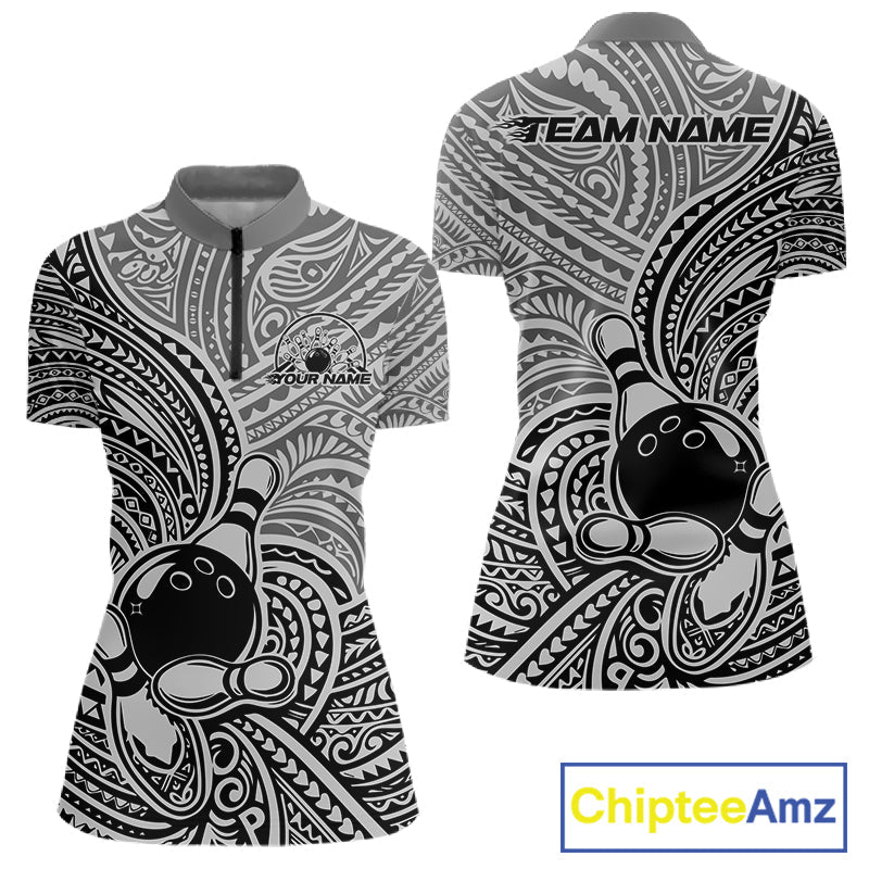 Custom Black And Gray Traditional Samoan Tribal Polynesian Pattern Bowling Women Shirt IPHW10324