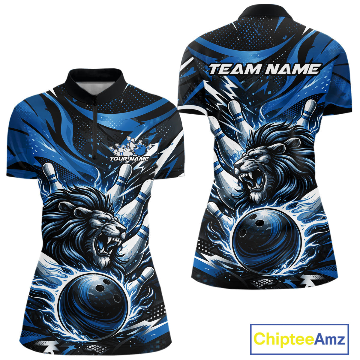Custom Deep Blue Flame Bowling Ball Lion Bowling Jersey, Women Quarter-Zip Bowling Shirt IPHW10349
