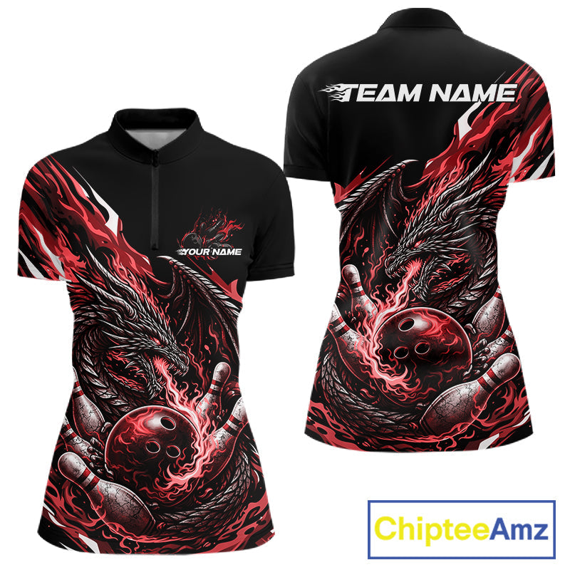 Custom Red Flame Dragon Bowling Women Quarter-Zip Team Shirts, Bowling Tournament Shirt IPHW10360