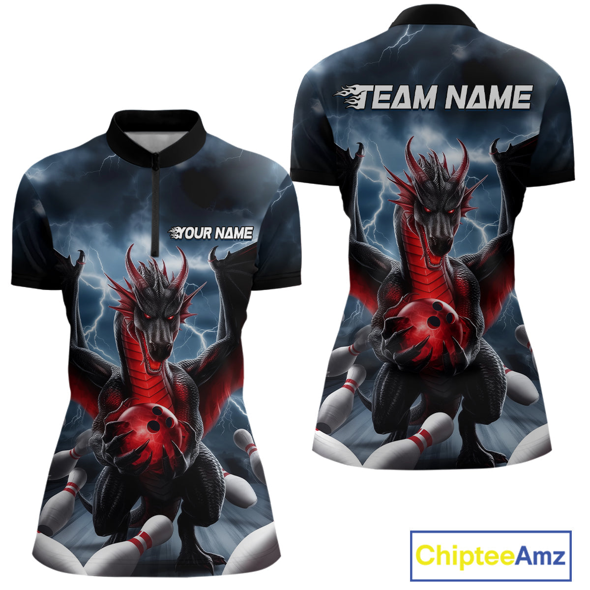 Custom Red Dragon Bowling Women Quarter-Zip Shirts, Dragon Bowling Team Tournament Outfit IPHW9106