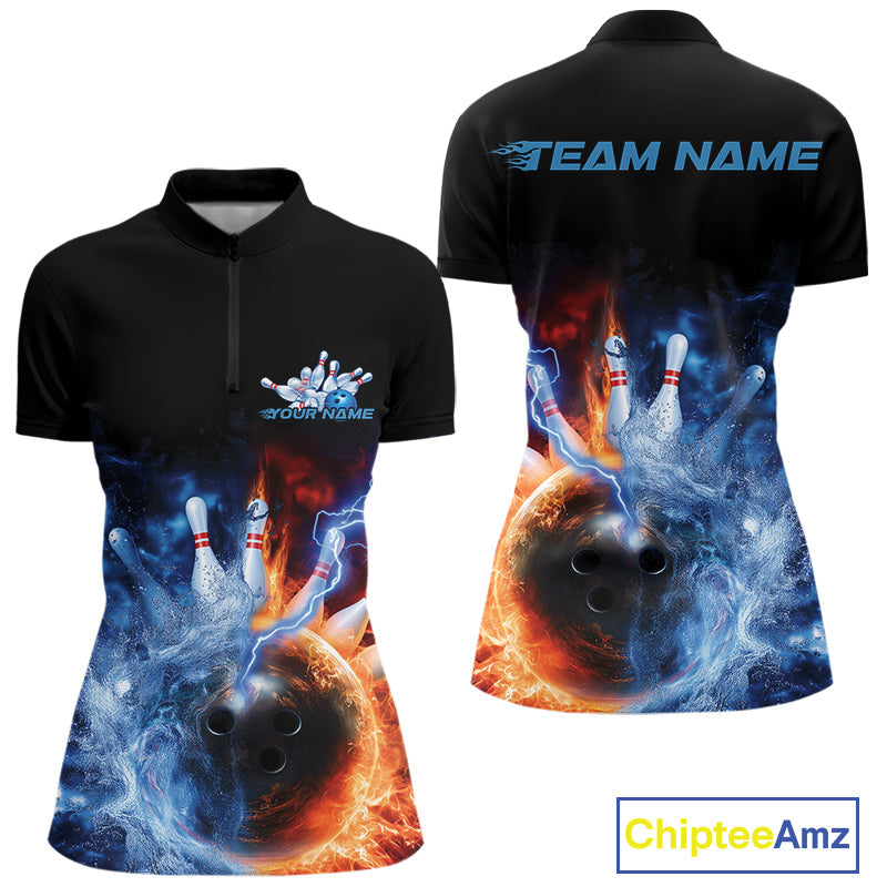 Custom Water And Fire Bowling Team Women Quarter-Zip Shirt, Lightning Bowling Uniform IPHW9449