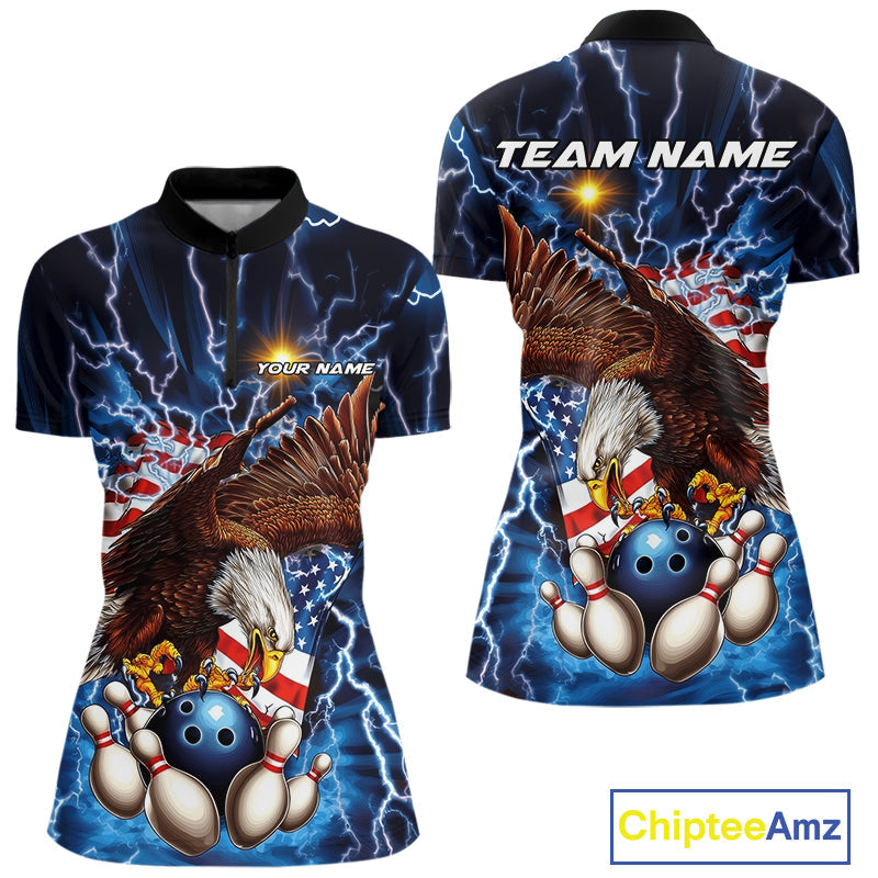 Custom Blue Lightning US Eagle Bowling Team Women Quarter-Zip Shirts, Patriotic Bowling IPHW9477