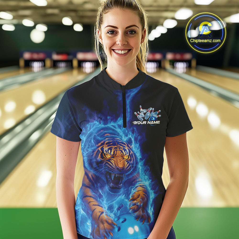 Custom Blue Fire Flame Tiger Bowling Team Women Quarter-Zip Shirts, Tiger Bowling Jerseys IPHW9483