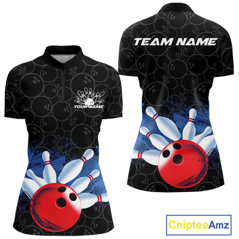 Custom Bowling Pattern Bowling Quarter-Zip Team Shirts For Women, Bowling League Shirt IPHW9545