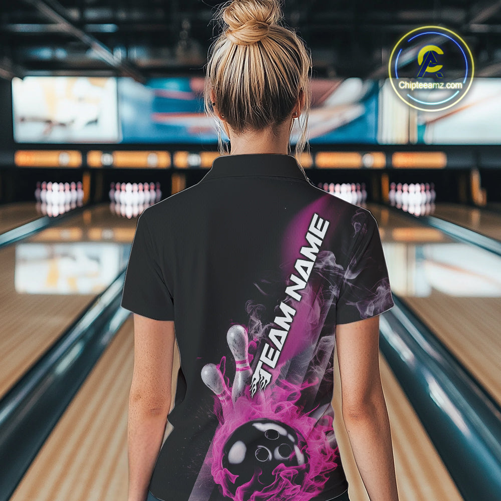 Custom Pink Flame Strike Bowling Team Quarter-Zip Shirts For Women, Fire Bowling Jerseys IPHW9573