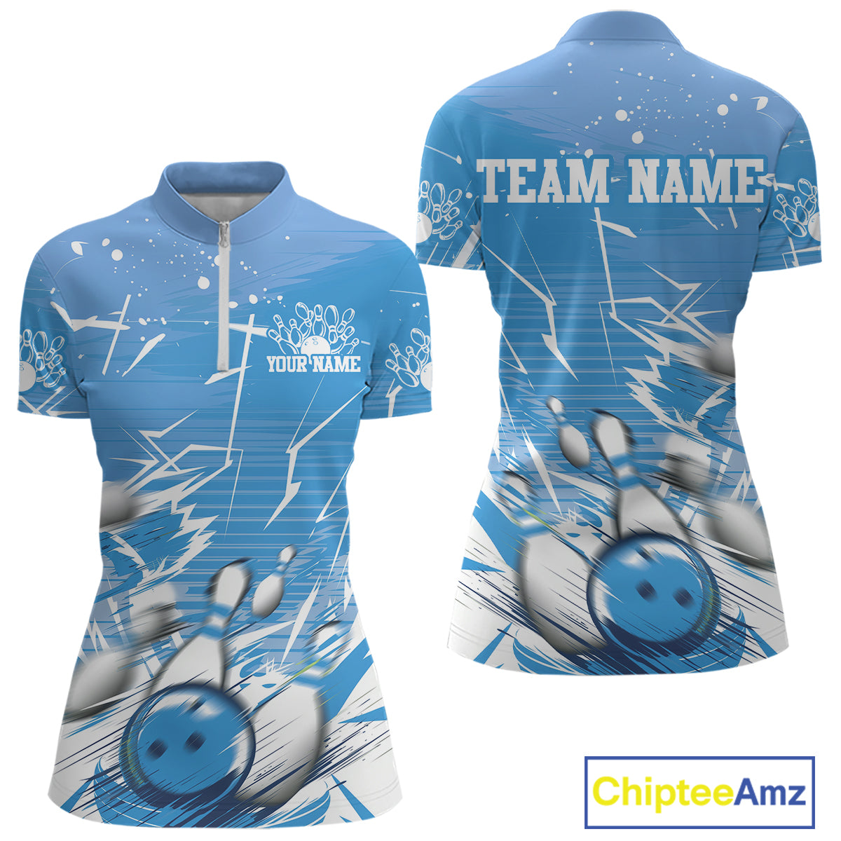 Custom White And Blue Bowling Team Women Quarter-Zip Shirt, Bowling Ball And Pins Jerseys IPHW9602
